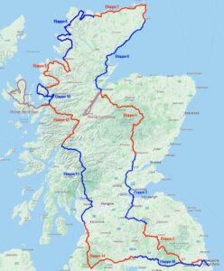 De etappes die we hebben voorbereid, zijn (op een 2-tal uitzonderingen in de 11-daagse trip na) allemaal korter dan 200 km (vaak ruim korter) en max. 3,5 uur rijden (meestal 2,5-3 uur, gerekend zonder stops). Omdat er onderweg genoeg te zien en te bezoeken is, willen we die mogelijkheid uiteraard ook bieden. Voor de liefhebbers van wat meer rijden, hebben we waar dat interessant is, ook iets langere routes (nog altijd max 225 km/4 uur) voorbereid. Voor mensen die graag onderweg een flinke wandeling of een uitgebreid bezoek aan een bezienswaardigheid of dorpje willen maken, zijn er ook (waar mogelijk) ingekorte routes, die een stukje van de “officiële” North Coast 500 afsnijden.